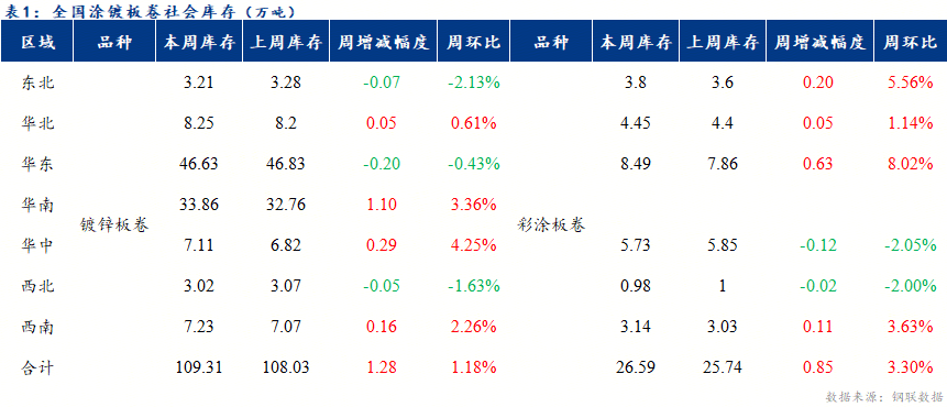 從區域庫存來看,鍍鋅庫存增加最多的是華南區域,增量為1.1萬噸;彩涂庫存增加最多的是華東區域,增量為0.63萬噸。